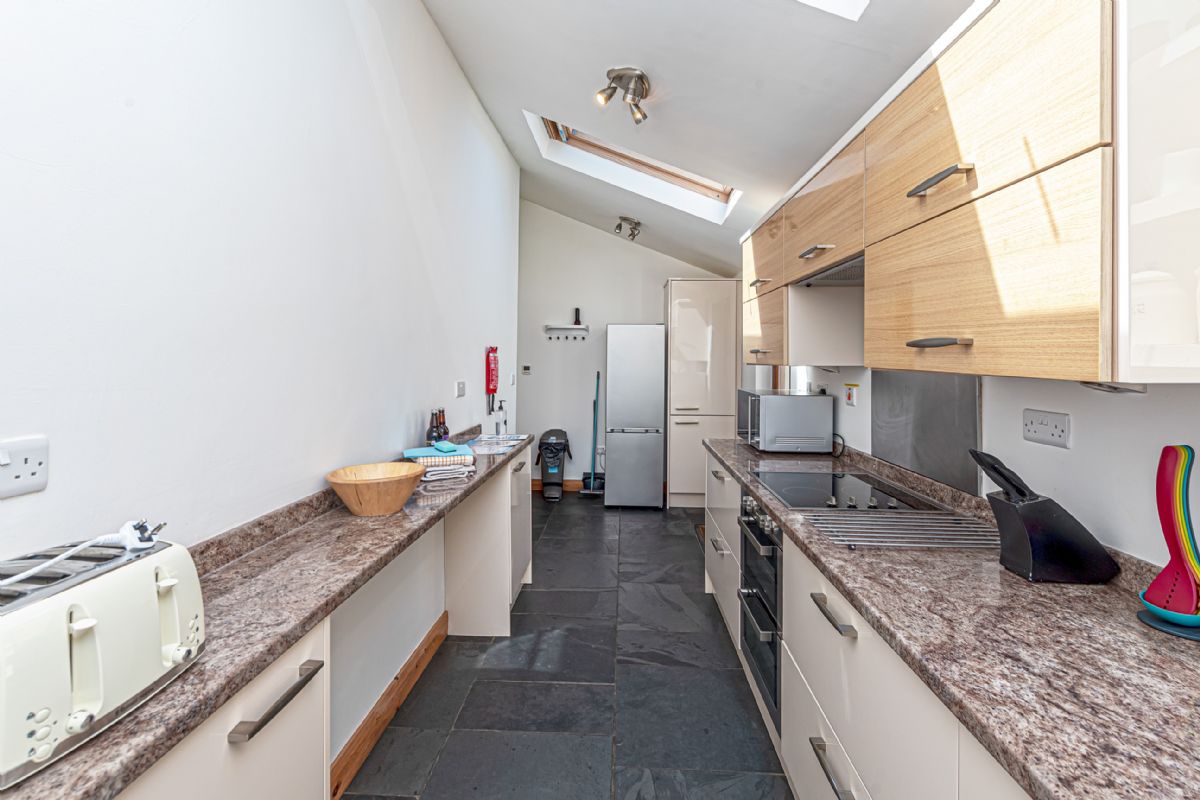 The airy and spacious living/dining room has comfortable sofas and chairs around a cozy log-fire, with widescreen TV with DVD and Freeview, and the dining area features a lovely oak table and chairs. There are two bedrooms, both of which have super king double beds which can be split to provide two full-sized single beds if required. The pretty main bedroom enjoys an en-suite bathroom with a walk-in shower. The family bathroom has a double-ended bath and a separate shower. Bed linen and towels are provided in the price of your rental. The bright modern kitchen has a double-oven & grill, ceramic hob, dishwasher, microwave, and fridge freezer, and is well-equipped for those who enjoy cooking.