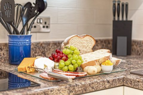 Along the ground floor corridor is a large modern kitchen with a fridge freezer, dishwasher, an eye level double oven, an induction hob, microwave, filter coffee machine, kettle, and toaster. The kitchen has been equipped to allow you to cook meals if you desire.
