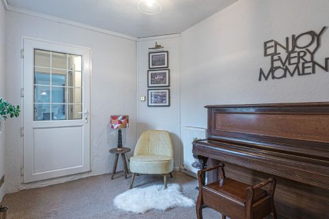 Along the corridor in the opposite direction is the snug, there is a piano in here and an occasional chair with lamp, creating a relaxing reading area.