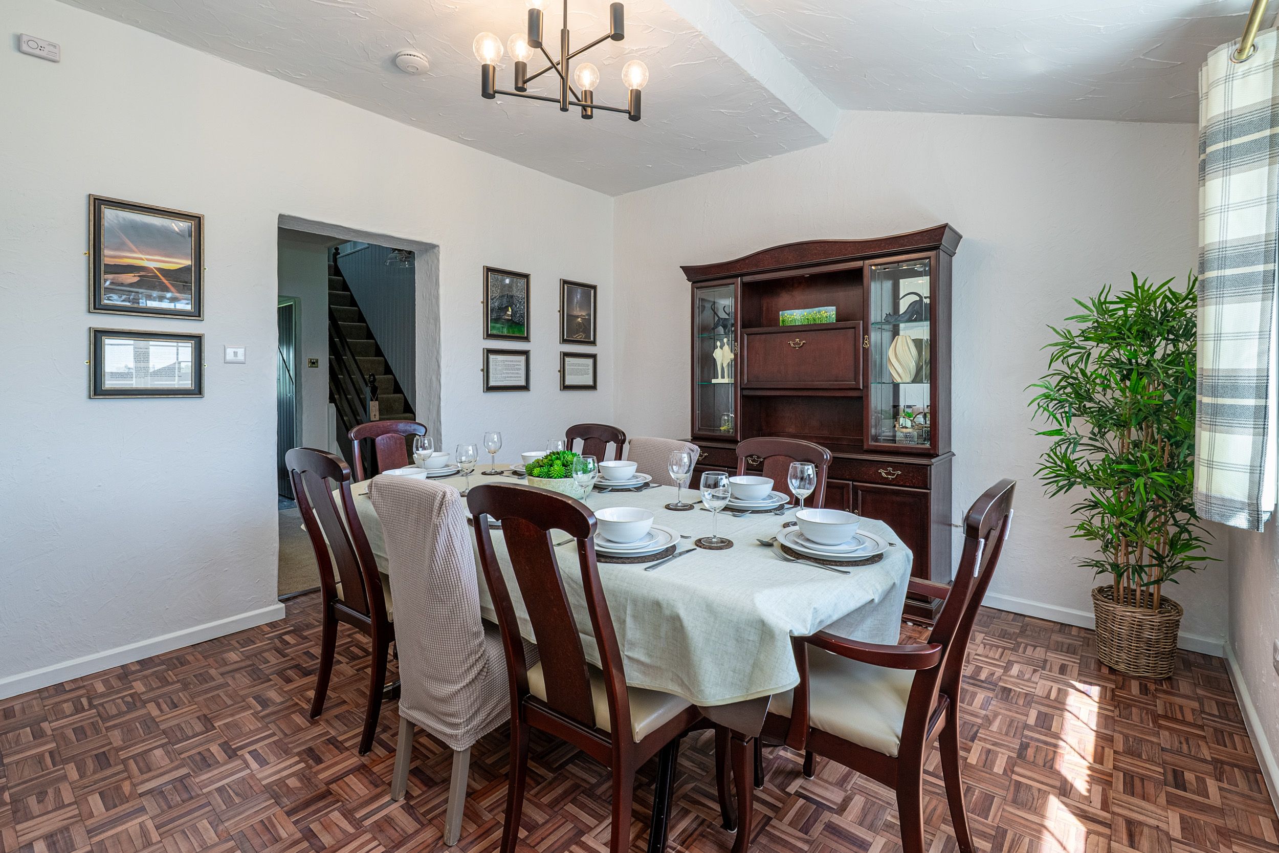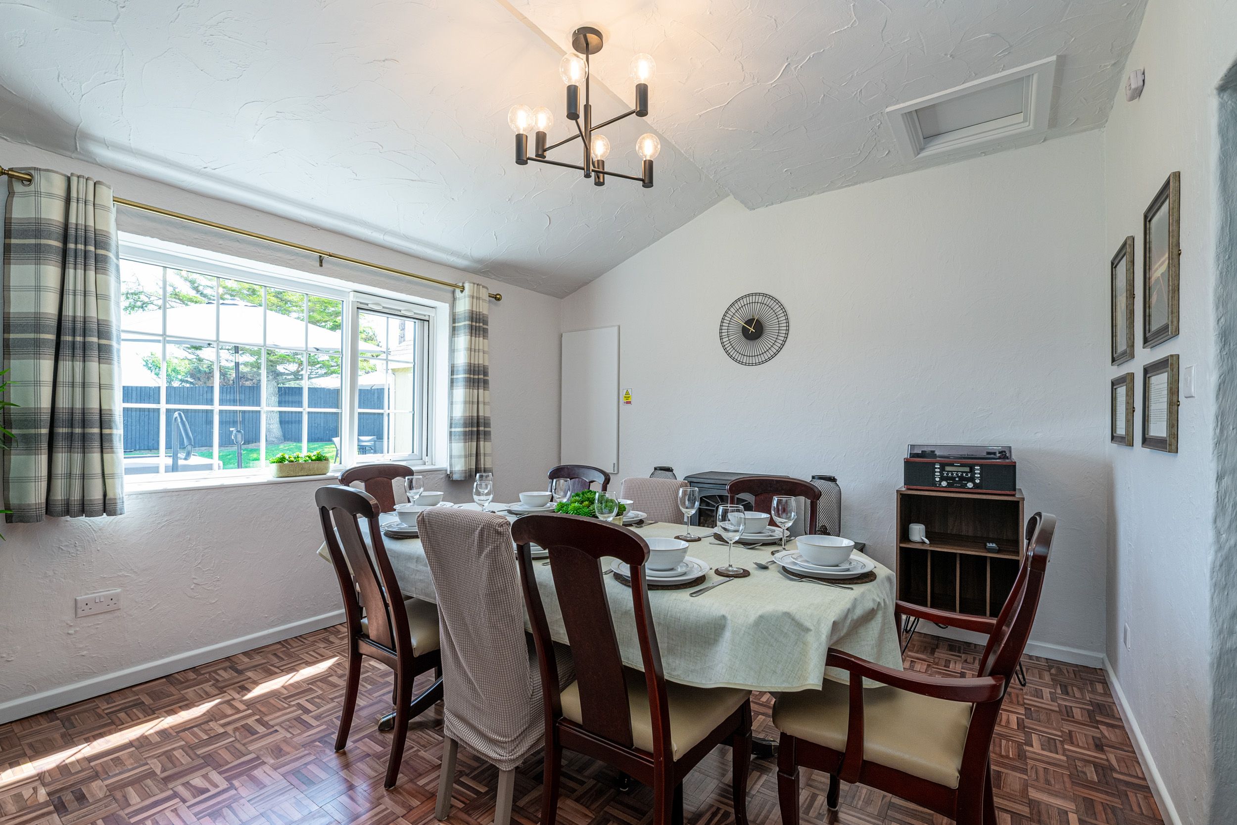 Straight ahead is the dining room with seating for eight people. There is a music centre available for your use so please feel free to bring your vinyl, CD’s or cassettes or connect to the rechargeable Bluetooth speaker. There is a gas fire in this room (please refer to instructions in the folder in the utility room) and an electric infrared wall panel heater.