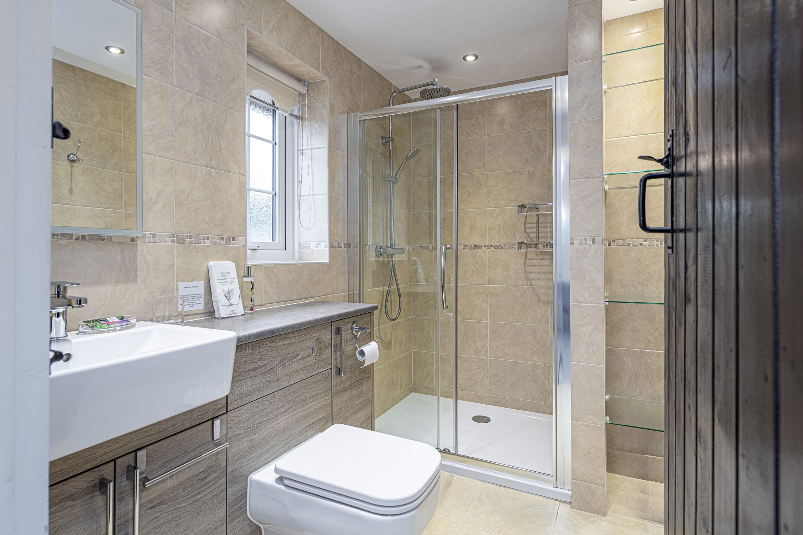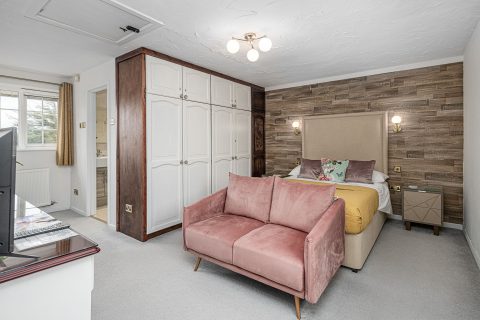 Opposite the dining room is the staircase to the first floor double bedroom. The bedroom is a large bedroom with a double bed, fitted wardrobes, a dressing table, sofa and a modern ensuite bathroom with double shower. There is a Smart TV with inbuilt freesat and a Google Chromecast fitted if you would prefer to cast from apps on your phone, laptop etc.