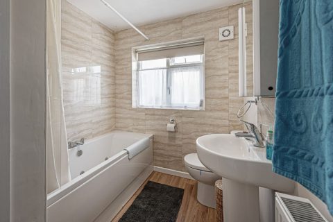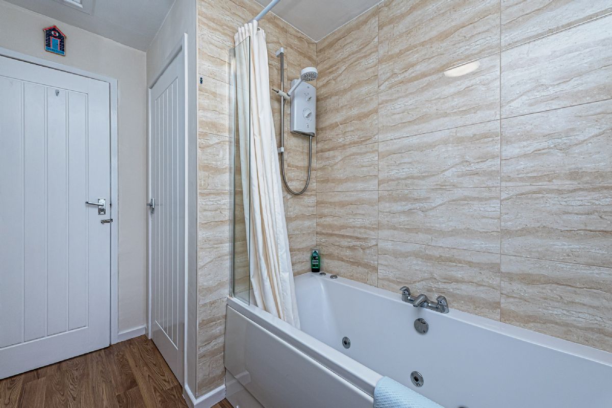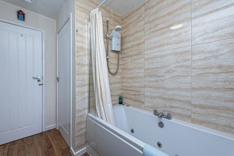 Bathroom with toilet, whirlpool bath, shower and sink.