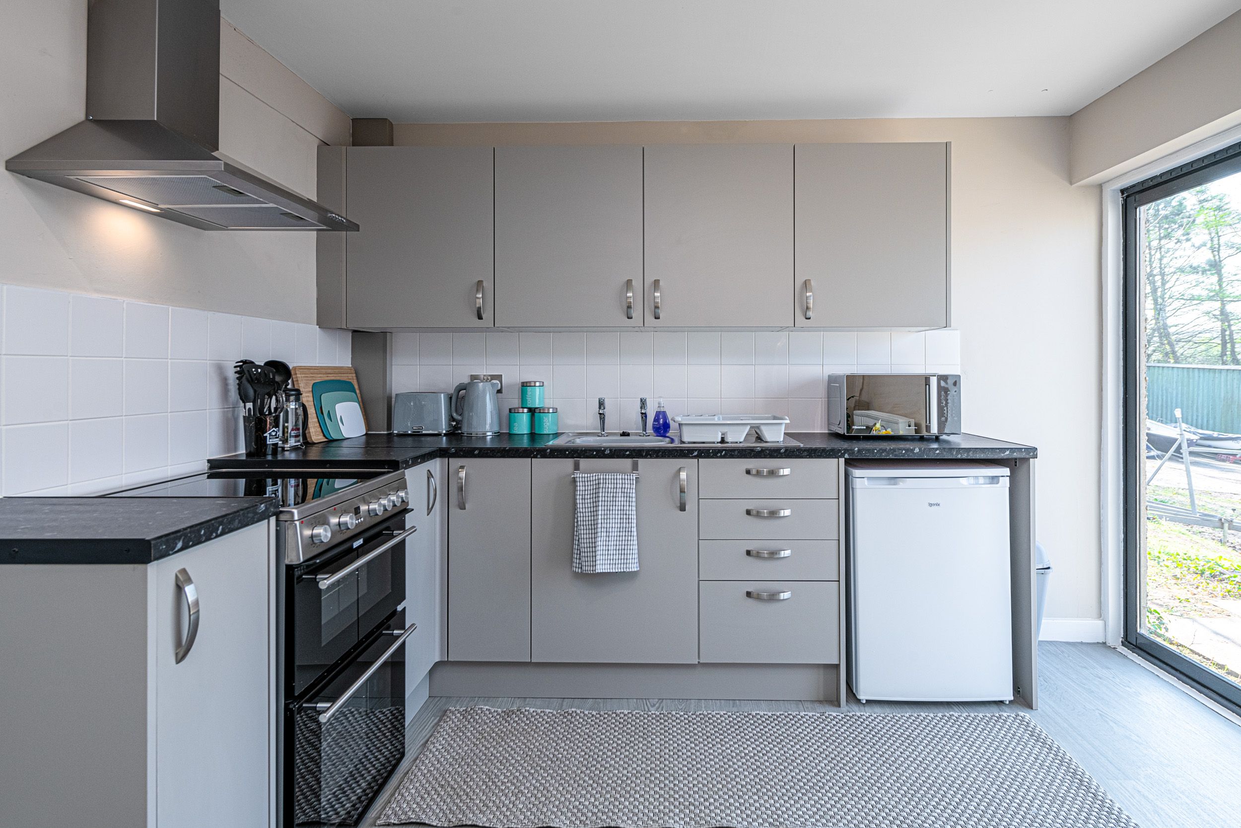 Kitchen: Fully equipped with an under-counter fridge, cooker, and microwave