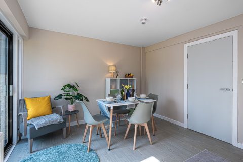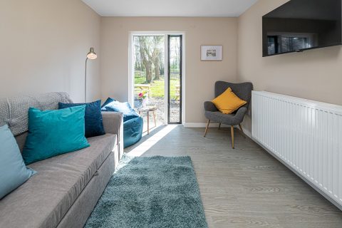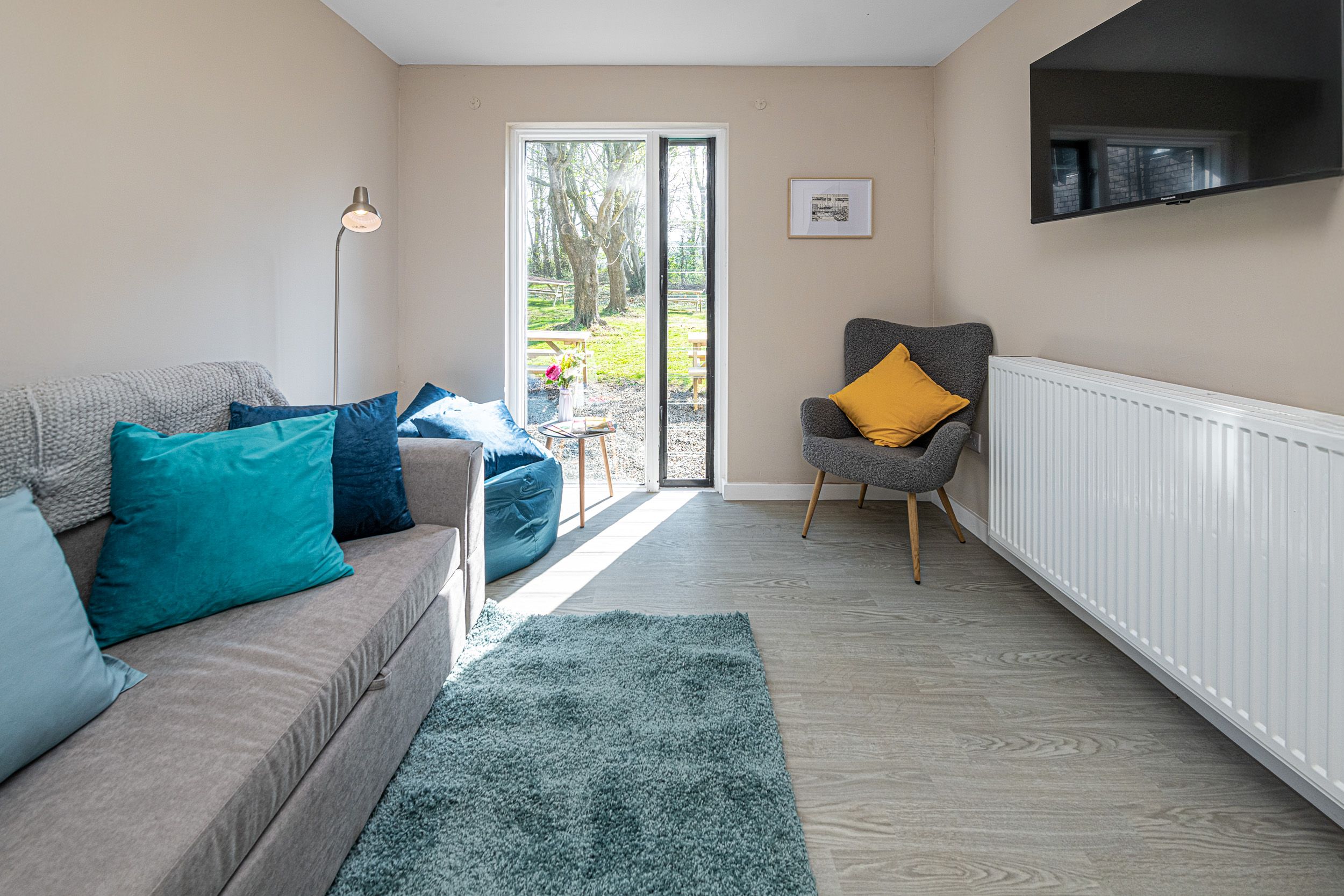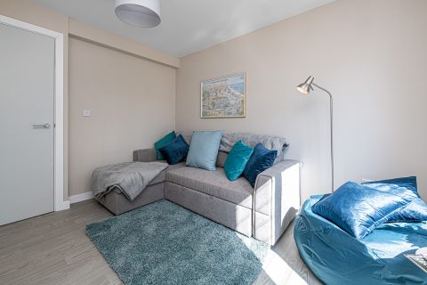 Sofa bed and smart TV along with additional seating and break out space.