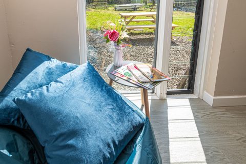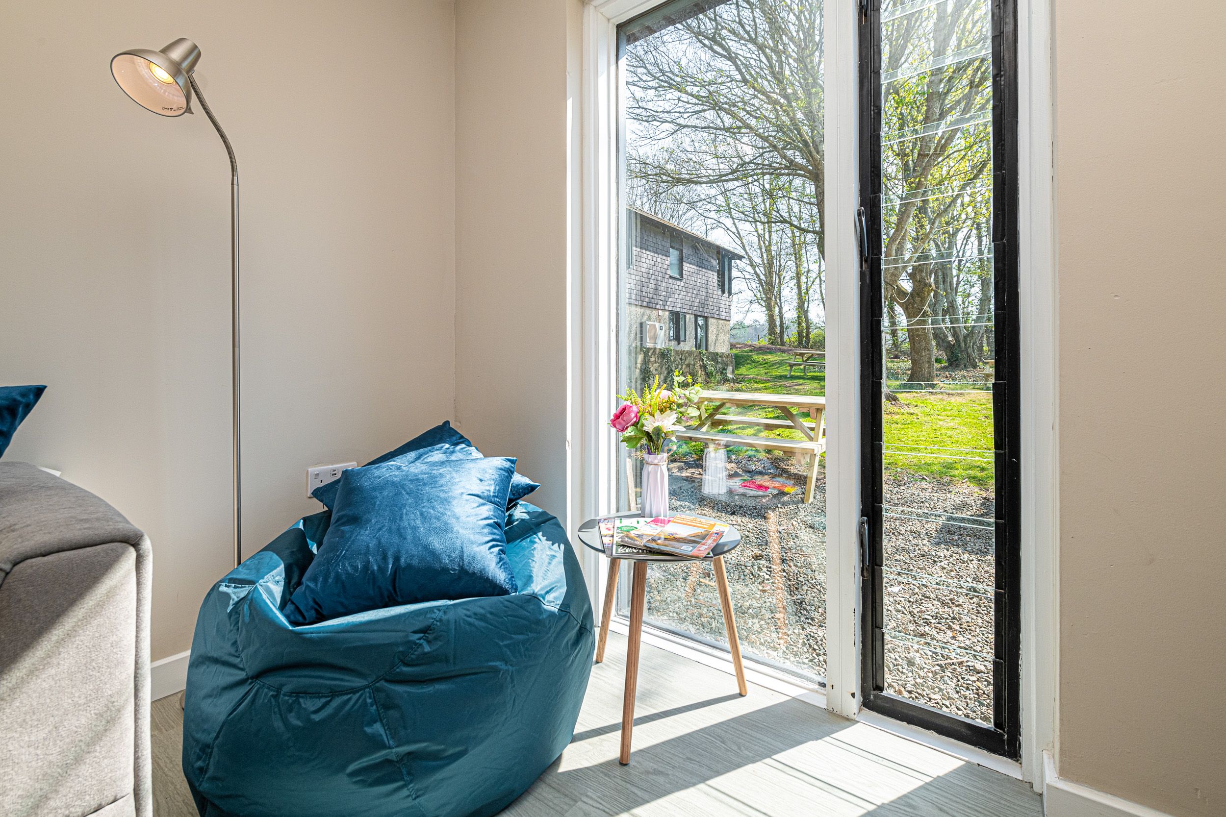 Small patio area with shared garden and picnic tables. Access to the grounds of Plas Menai along with cycle pump track, outdoor spaces and mountain bike trac
